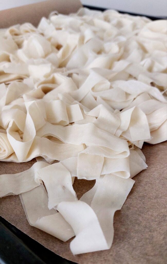 Tijesto za savijače narežite na trake otprilike širine prsta (vidi fotografiju) i pustite ih da se malo posuše na zraku onako kao kad sušite rezance. Narezala sam ih ujutro, kolač pekla poslijepodne. Premažite kalup za pečenje maslacem.